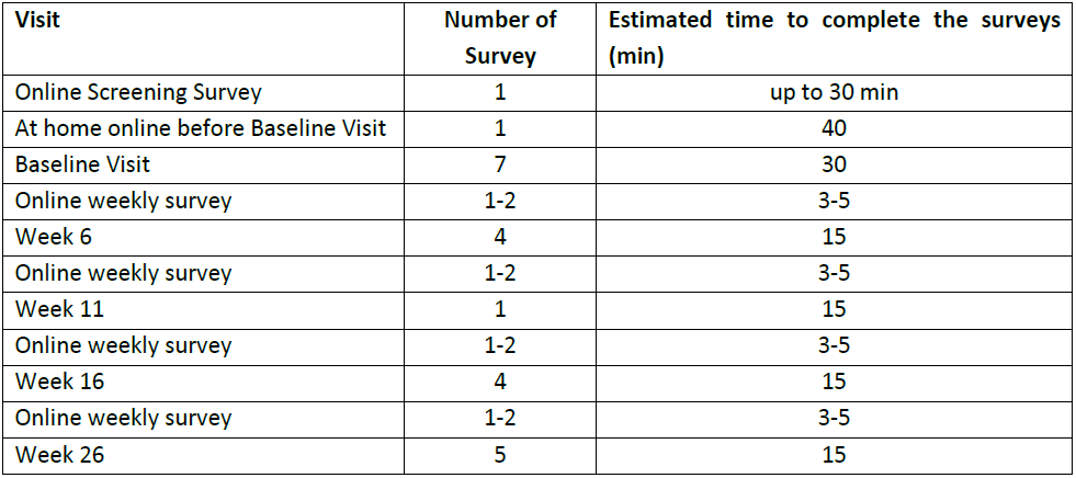 Please refer to the following study visits diagram for more details regarding the time spent at each study event.